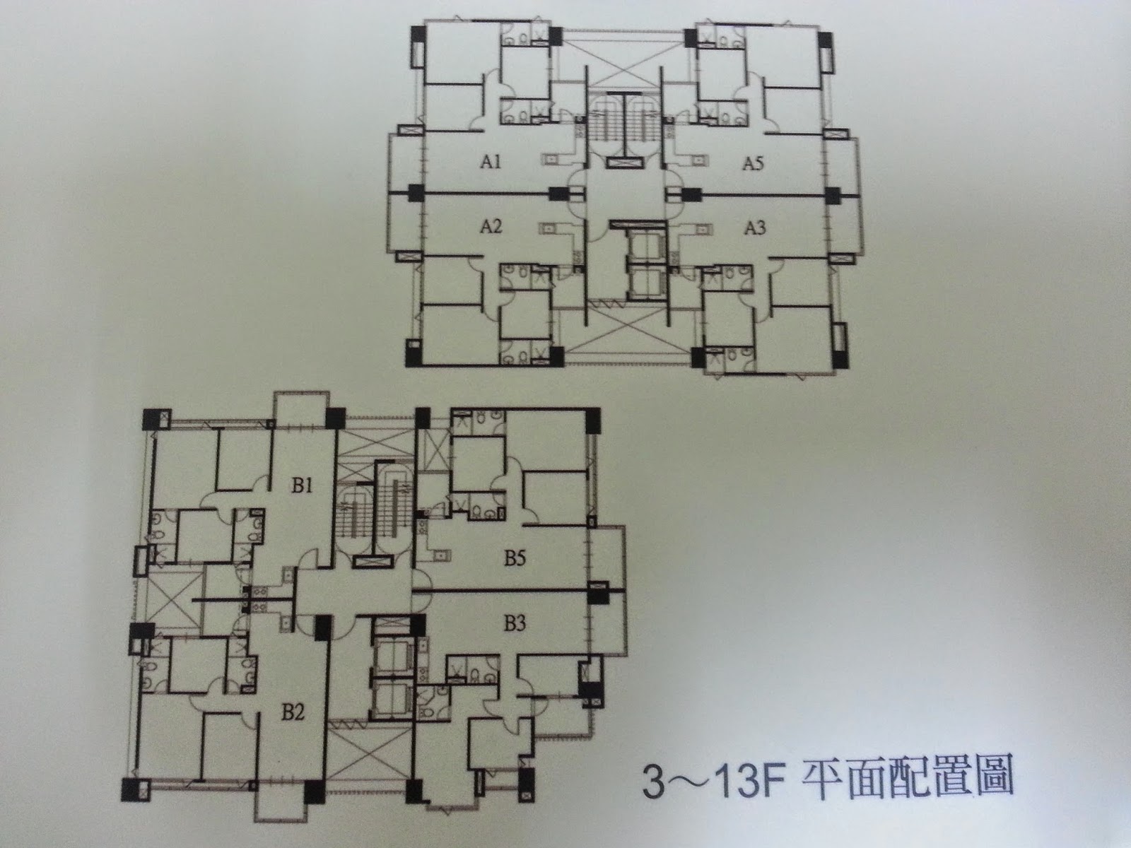 右上是A棟,左下是B棟,一棟配4戶。其中B3的衛浴沒對外窗