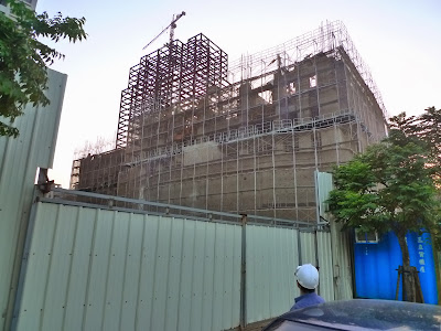 基地緊臨的南側是目前施工中的大砌磐峰 (寶佳建設), 外牆鷹架正在落下 (不過比較慘的是這個建案的住戶, 得要忍受國賓大悅三年多的工期以及德鑫建案二至三年的施工黑暗期)