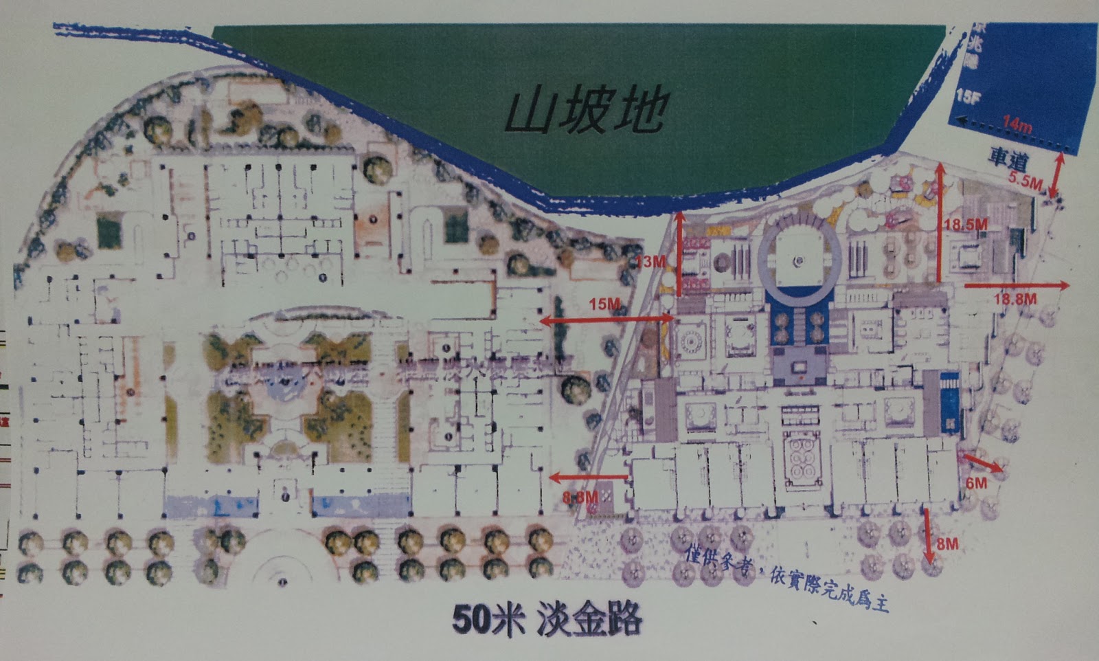 - 購屋交戰:建物右側(A棟)與鄰棟有8~15米距離,所以A棟低樓層採光怕有影響。前面面向大屯山,是禁建區,未來應該不會有建築物,但是考量輕軌的站體可能有風水影響,所以前面最好4F以上,才能享受大屯山舒適開闊的視野。後面則是山坡地及草地,會不會有建築物不得而知了,但是低樓層可以看到公設的造景設計,如果以代銷中心表示要打造大氣宏觀的公共設施,低樓層會有獨特的賣點。