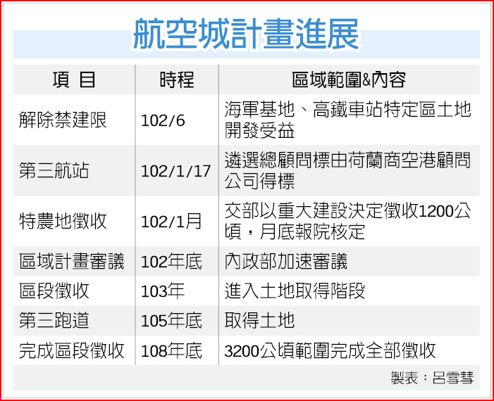 航空城計畫之前延宕那麼久,有很多時間是在與軍方斡旋,現在終於獲軍方支持,空軍機場將廢除;海軍基地也將南移到屏東,也就是說所有障礙都已獲得排除,目前確定都市計畫預定103年初核定,106年以後第三航廈可望順利完成,待航空城計畫完成後,將持續帶動桃園縣未來幾十年的繁榮和發展。